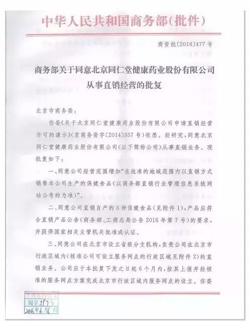 近日笔者获悉,上市国企同仁堂集团旗下子公司——北京同仁堂健康药业股份有限公司,已经获得商务部印发的直销经营许可批复函(详见附件),8款保健食品已通过商务部审批,并获准在北京市设立省级分支机构和所辖16区设立服务网点。